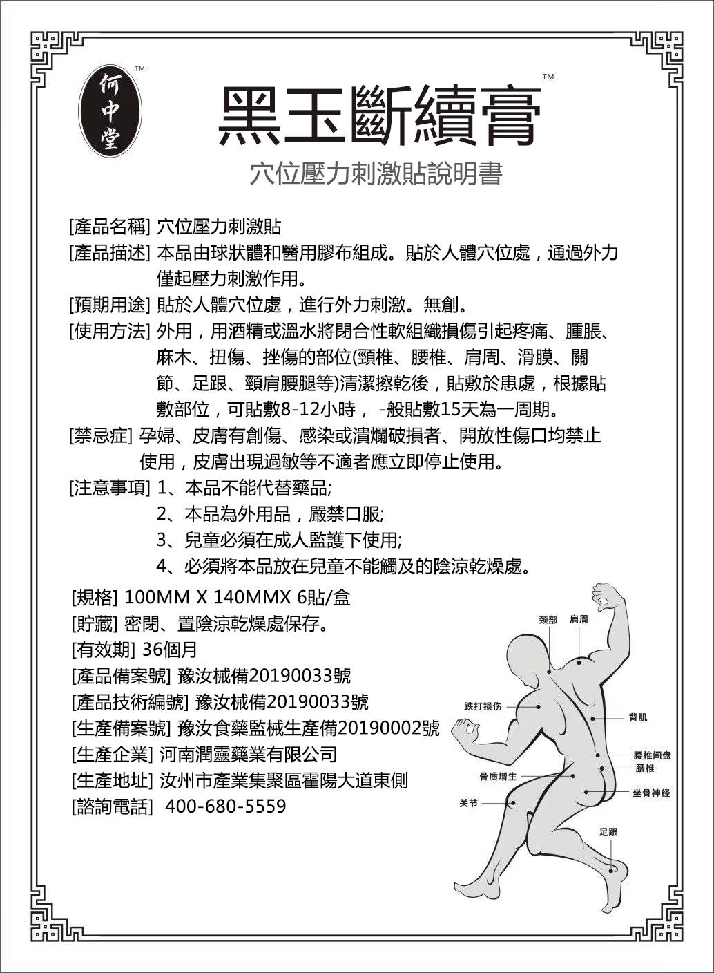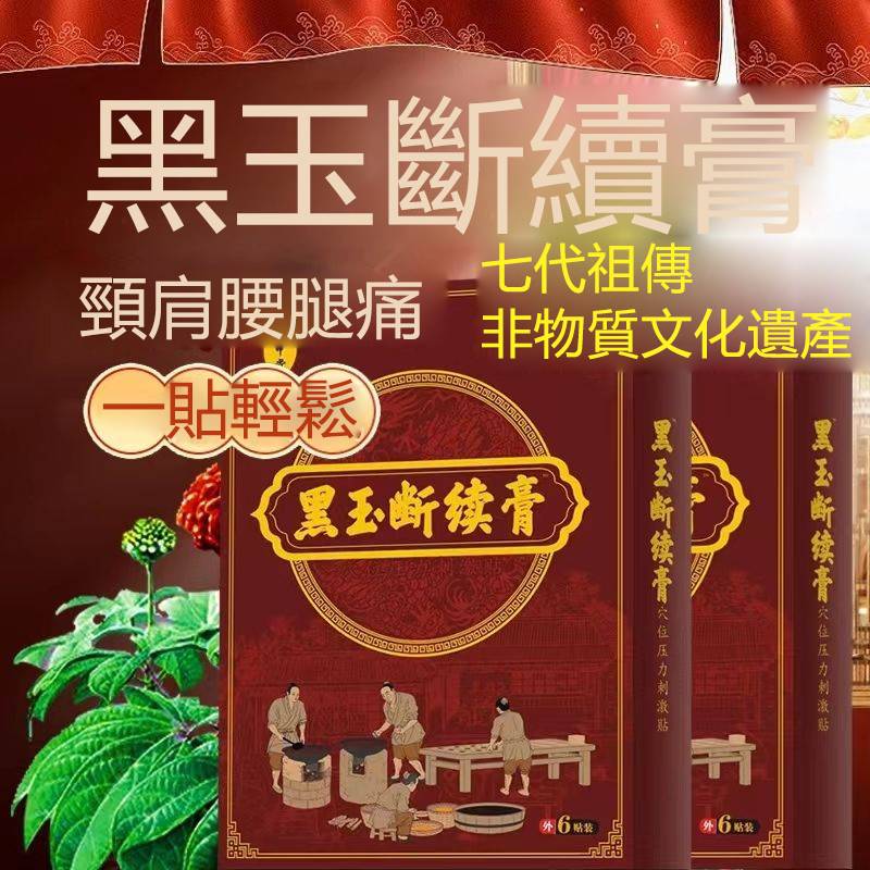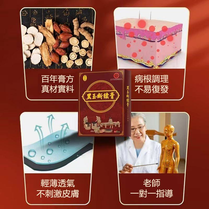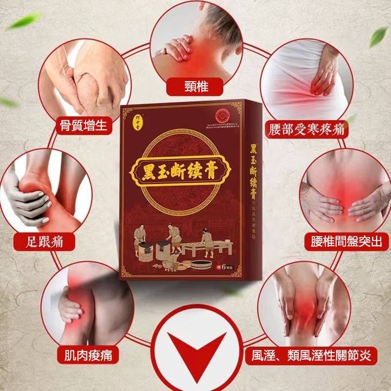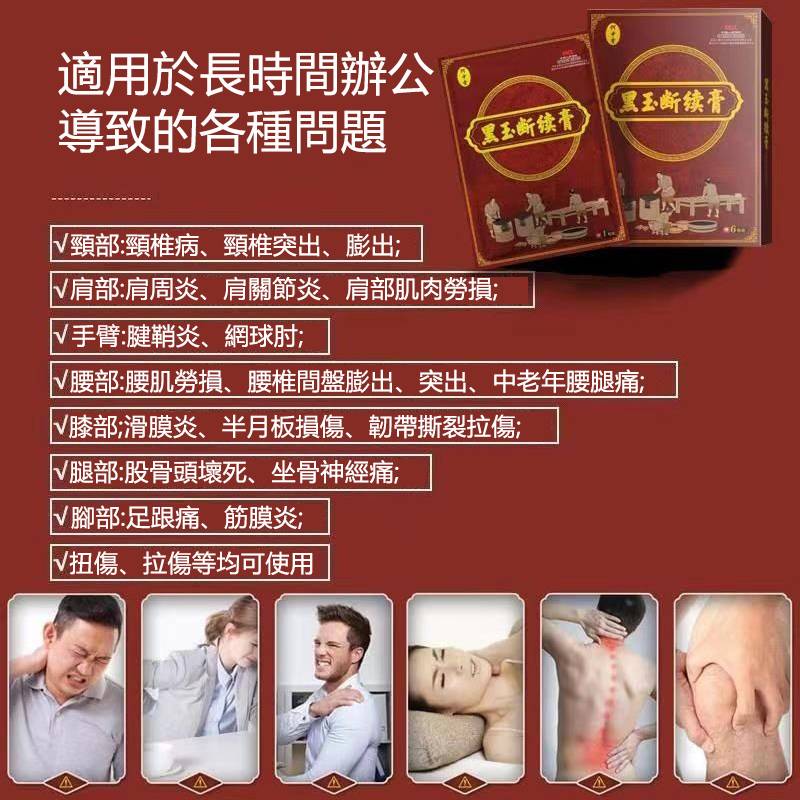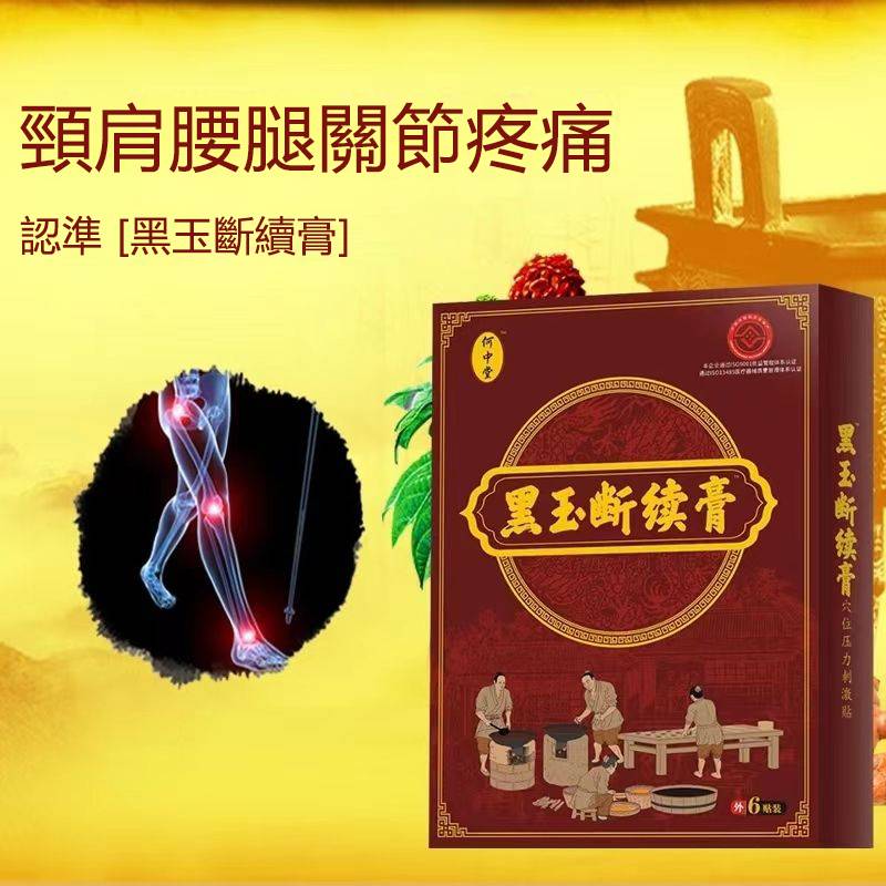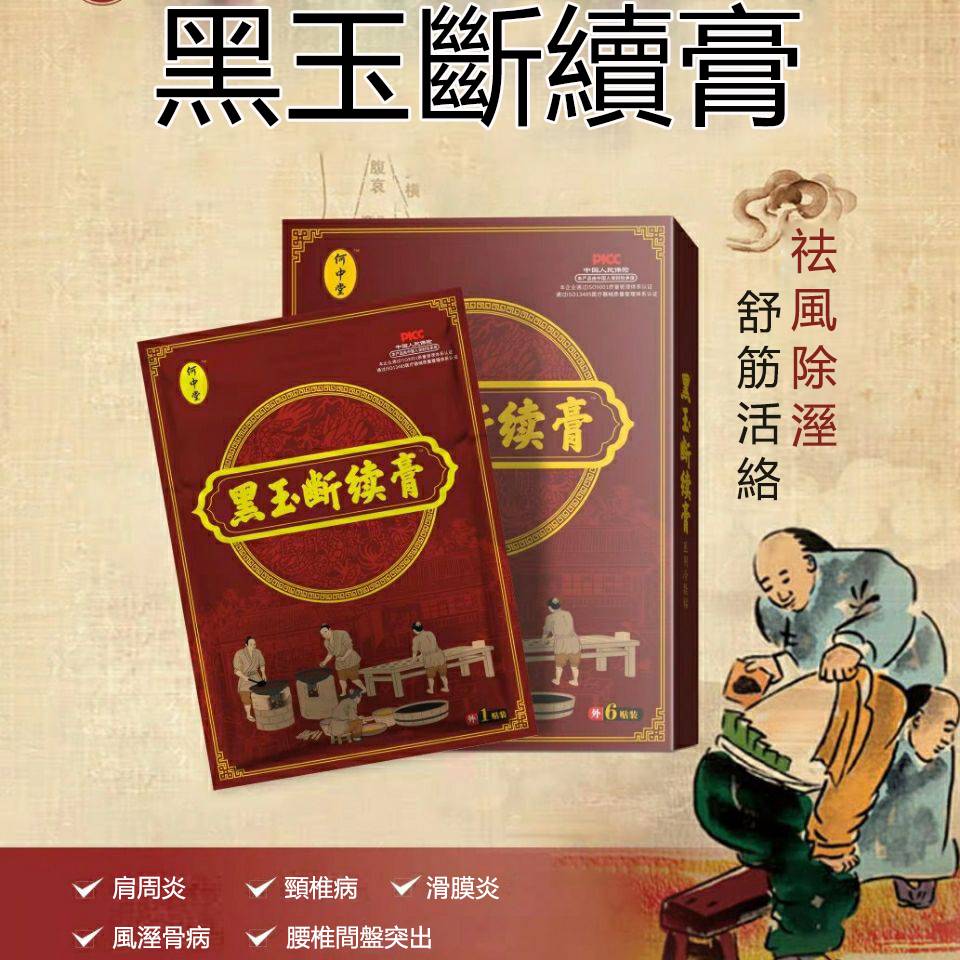 何中堂黑玉斷續膏,適用於急性期疼痛、腫脹、扭挫傷,專治療腰間盤突出、腰肌勞損、關節炎、滑膜炎、頸椎痛、膝蓋痛藥貼布或久病勞損的反覆性疼痛進行敷貼。